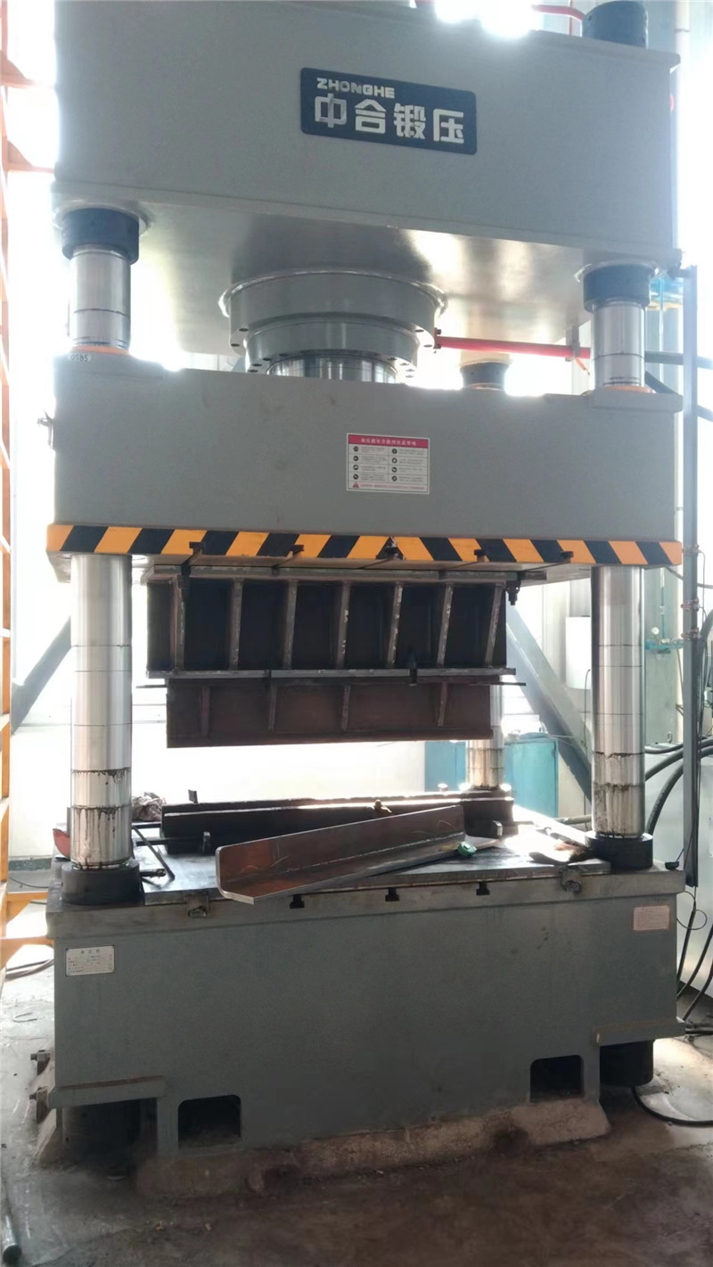 630噸金屬折彎壓型液壓機(jī)是用于金屬厚板的折彎壓型的設(shè)備,整體采用三梁四柱結(jié)構(gòu),利用金屬的延展性,通過(guò)模具將厚板壓型折彎。如下圖: